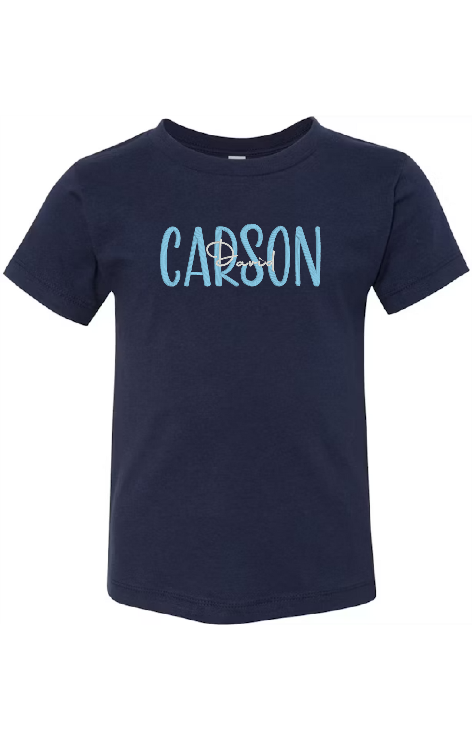 Classic, bold, and personal—this custom kids’ t-shirt is made just for your little one! Designed exclusively on a soft navy tee, the shirt highlights your child’s first name in large light blue letters with their middle name in smaller white script layered over the front. The color combo makes for a clean and stylish look perfect for any occasion.