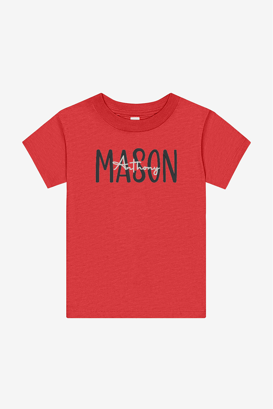 Personalized boys’ tee with first name in bold black and middle name in white script on a bright red shirt. A unique keepsake for birthdays or everyday wear!